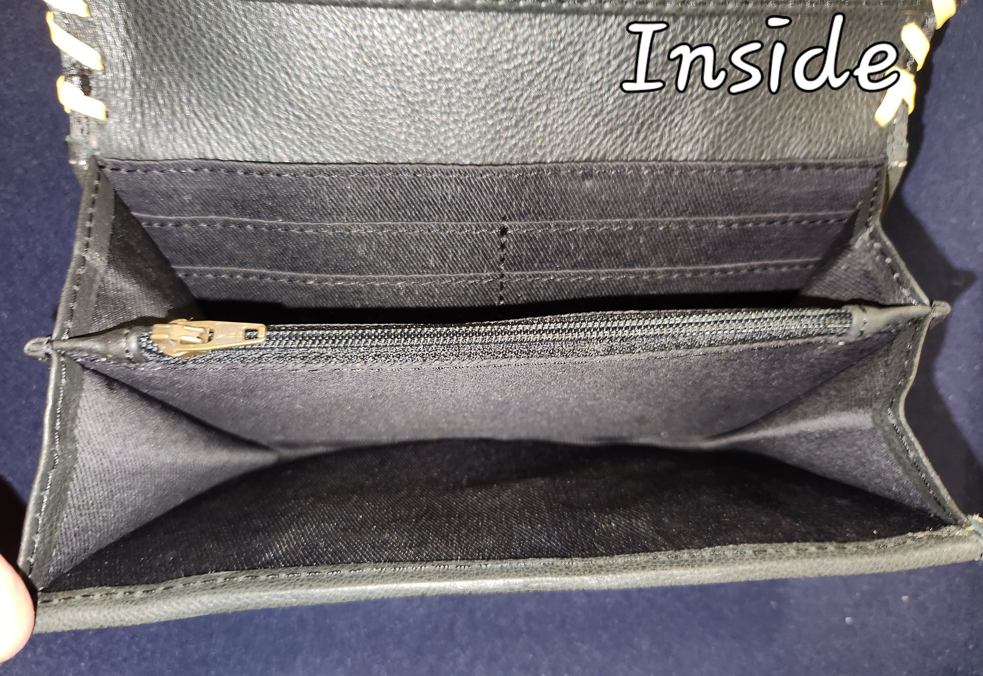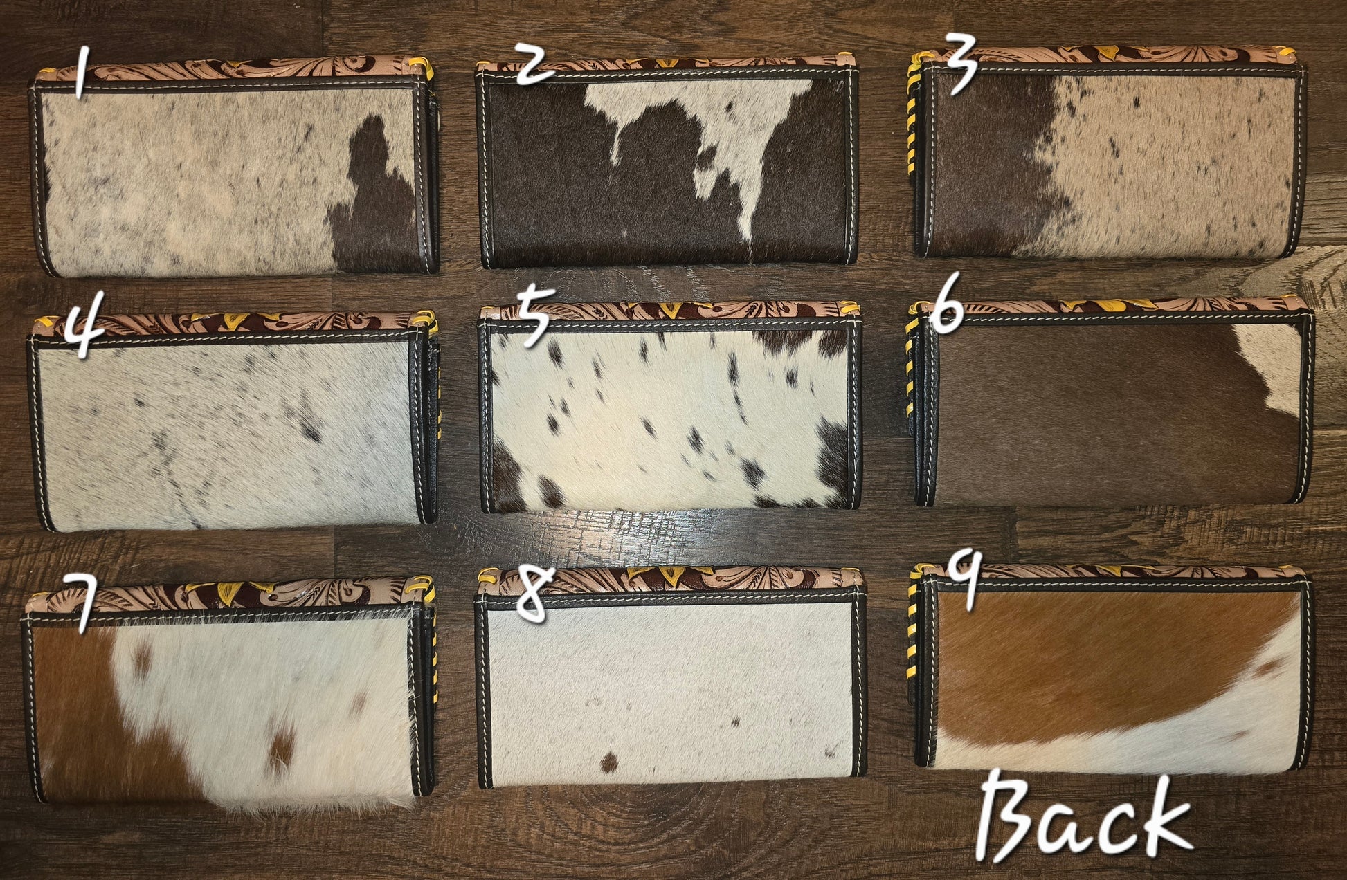 Checkout this tooled leather and Cowhide wallet/clutch. Size is 4 1/2" x 8". Has multiple card slots inside, zipper, checkbook/cash slots, pocket storage on the outside back. You will receive the fur on hide you select.